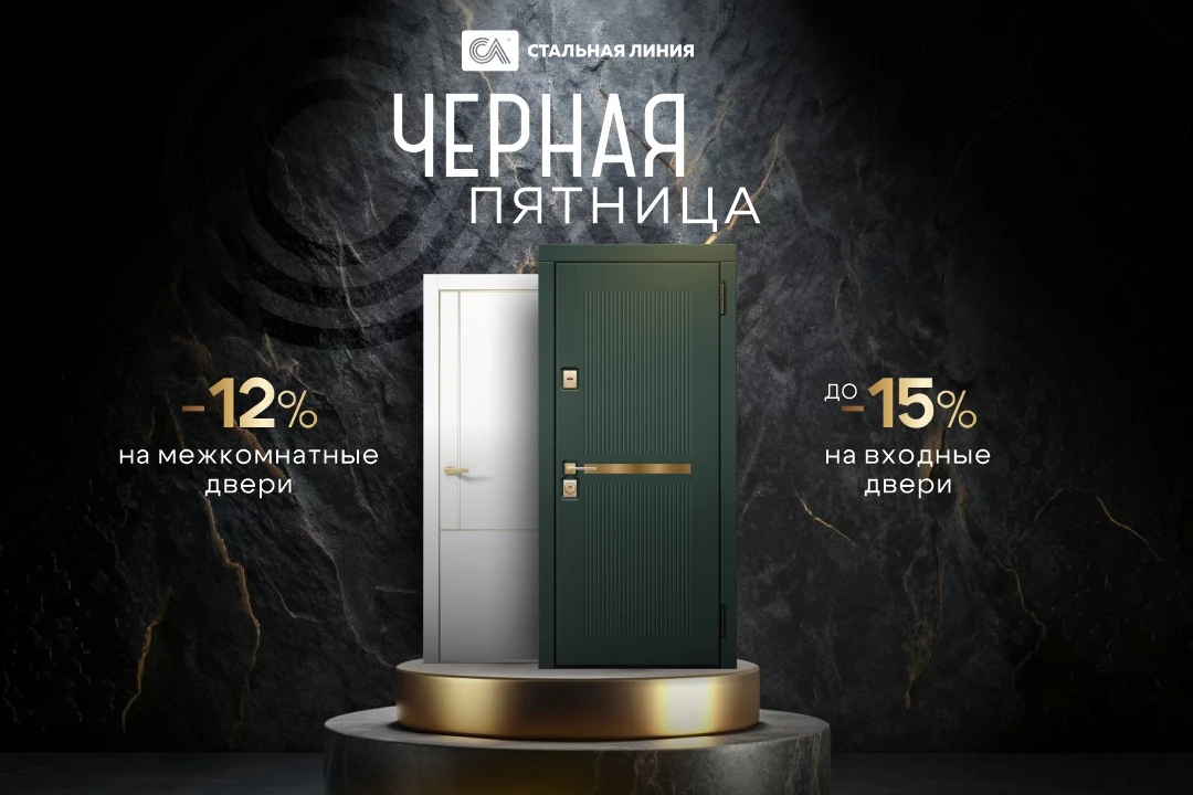 ЧЕРНАЯ ПЯТНИЦА в магазинах «Стальная линия»! Только с 7 по 16 ноября 2025 года скидки до 15% на входные двери под заказ, а так же 12% на межкомнатные двери.