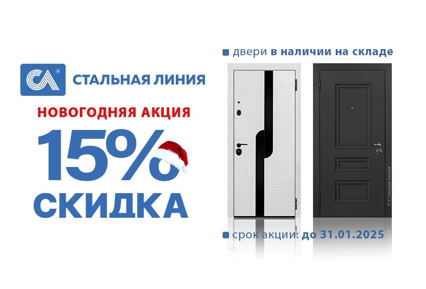 Дорогие друзья! Новый год стремительно приближается, а вместе с ним и приятные сюрпризы от компании «Стальная линия»! К уже имеющимся скидкам мы добавили дополнительную скидку 15% на складские двери, которая будет действовать с 20.12.2024 по 31.01.2025 и даст возможность сделать долгожданный подарок для вас и вашего дома.